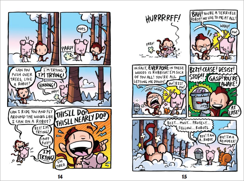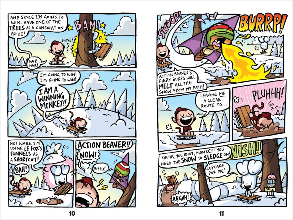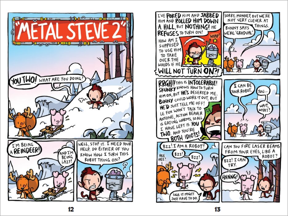 Since he crash-landed to Earth in a rocket, Monkey has been causing absolute mayhem! Bunny and the gang (Squirrel, Pig [the Pig], Action Beaver, and Skunky the Inventor) have almost had enough. Monkey’s eternal struggle for world domination is getting more ridiculous every day, and it’s impossible to predict which bizarre plan he’s going to put into action next . . .