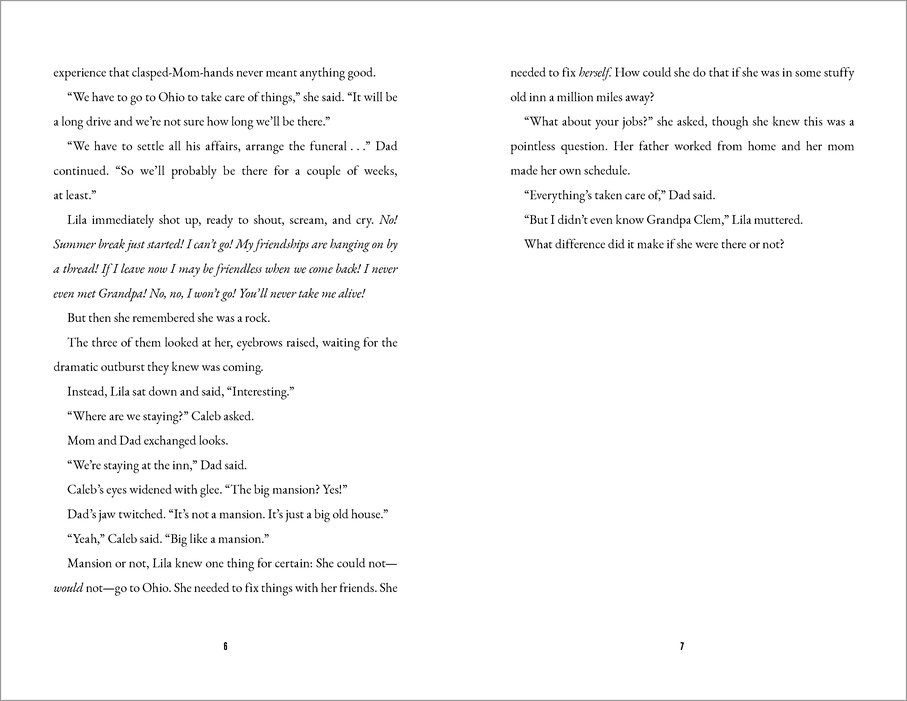 But then Lila’s estranged Grandpa Clem dies. Now she’ll have to spend the summer in Ohio while her parents decide what to do with Grandpa Clem’s creepy Victorian Inn. En route to Ohio, the family gets into a scary car accident. No one’s hurt, but the remainder of the trip is … odd. At every rest stop, Lila sees people no one else can see or hear…